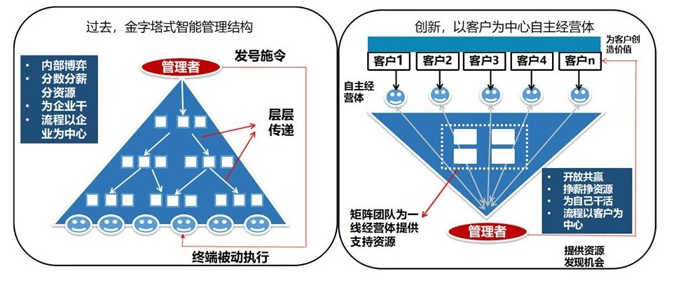 传统科层存在以下弊端:1、流程以决策层为制高点,依次传递,反馈、指挥、决策链冗长,反应速度慢,决策质量低,2、部门壁垒厚重,边界分明,现场决策不灵活,3、市场压力难以快速有效的传递到企业内部每一个员工、无法感受市场温度;4、员工成为被动的执行者,缺乏有效的激励机制,难以长久激发员工活力。